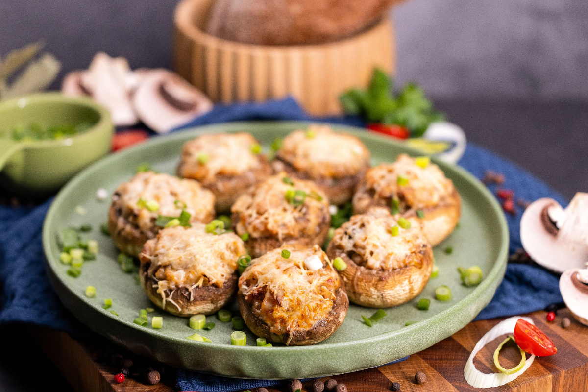 Самые свежие шампиньоны работают в качестве основного ингредиента, обеспечивая надёжный каркас для сочной начинки. Основные компоненты: