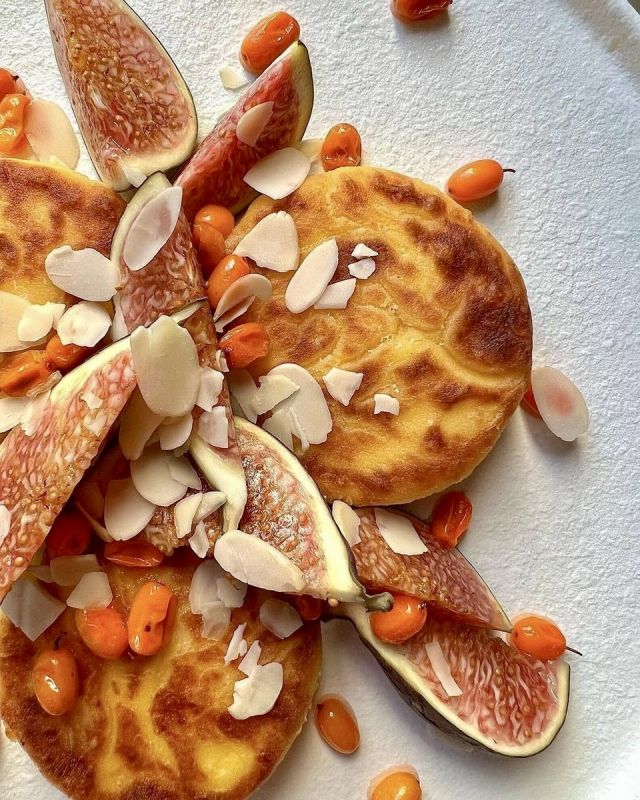 На финальном этапе подаем сырники с любимыми фруктами, ягодами и изысканными миндальными лепестками — и наслаждаемся волшебным вкусом осени!