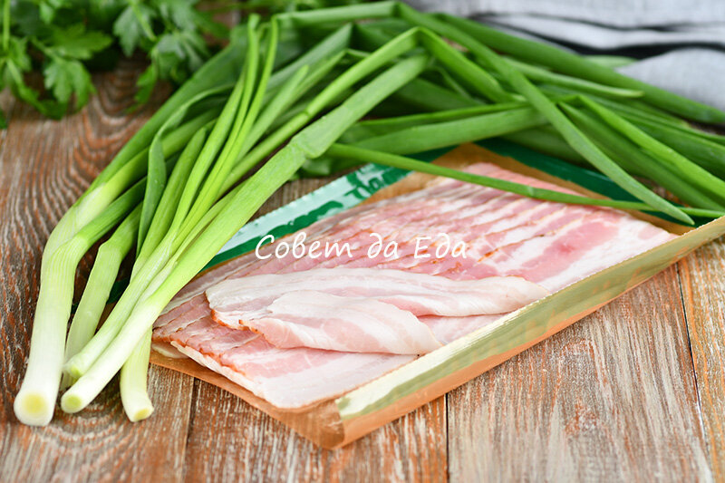 - Откройте холодильник: достаньте 150 г бекона и ~100 г зелёного лука.