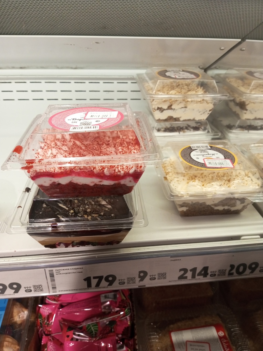 В разделе сладостей представлена богатая линейка десертов, среди которых порционные пирожные, идеальные для чаепития. Маленькие лакомства позволяют попробовать различные вкусы без необходимости покупать целый торт. В ассортименте можно встретить шоколадные и фруктовые десерты, а также пирожное "малиновый бархат", хотя его цена может удивить — 179 рублей за упаковку, в то время как аналоги в других сетях значительно дешевле.