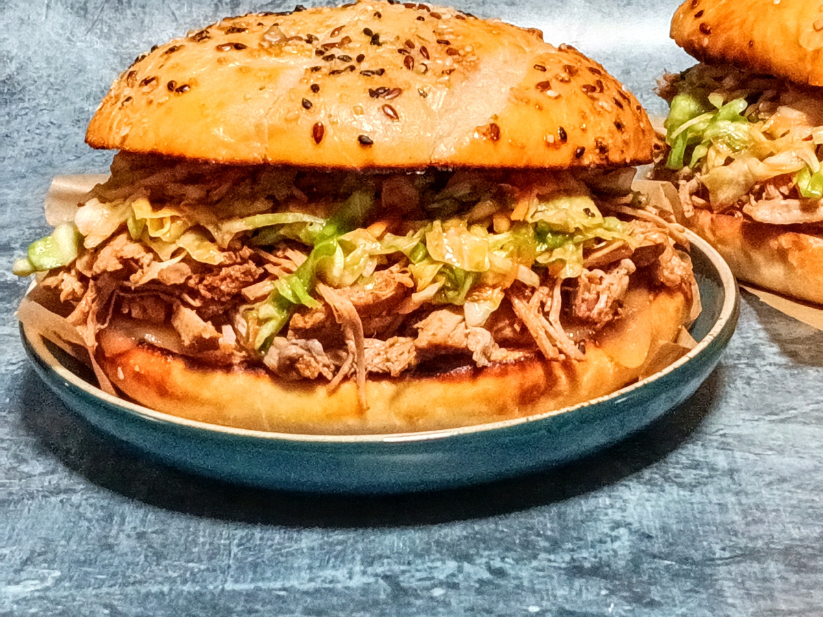 Когда свинина будет готова, разберите ее на волокна, добавьте процеженный бульон и перемешайте с соусом. Подавайте с поджаренными булочками, двумя кусочками сыра, рваной свининой и коулслоу.