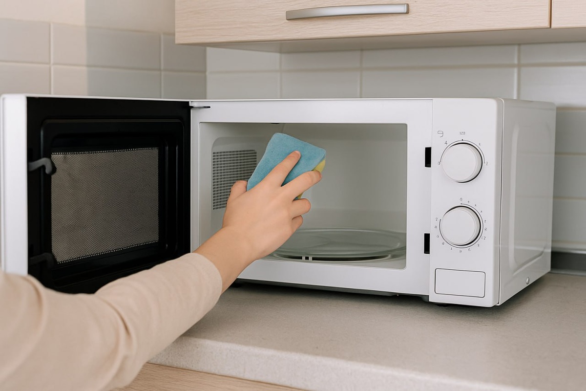 Если микроволновка сильно загрязнена, можно использовать комбинированный метод: сначала очищаем паром, а затем ещё и меламиновую губку, которая эффективно убирает грязь без химии. Это обеспечит блеск как для внутренней поверхности, так и для стеклянной тарелки.