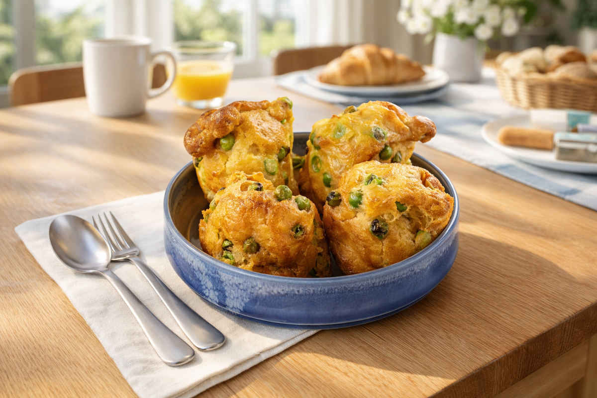 Разогреть духовку до 190 градусов. В каждую формочку для маффинов налить по чайной ложке растительного масла и смазать стенки. Отправить в духовку до подготовки остальных ингредиентов.В миске соедините яйца, молоко и просеянную муку. Приправьте по вкусу солью и перцем, затем отставьте в сторону. Сыр нарежьте кубиками.Также нарежьте ветчину мелкими кубиками. Достайте формочки из духовки, наполните их ветчиной, сыром и горошком. Затем залейте тестом до полного покрытия начинок, используя для удобства емкость с носиком.Верните формочки в духовку на 15-20 минут, до тех пор, пока пудинг не станет воздушным и золотистым. Подавать горячим или холодным на завтрак или в качестве закуски.
