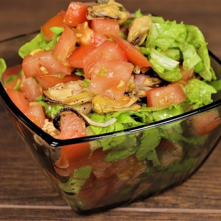 Готовый салат лучше всего подавать в чистой тарелке, пока помидоры не выпустили много сока. Приятного аппетита!