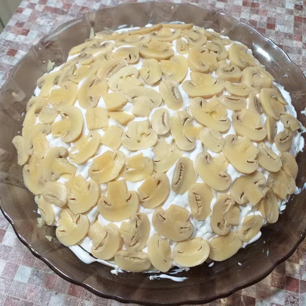 Теперь можно приступить к сборке салата. Возьмите салатник и начните выкладывать слои: первым будет нарезанная сельдь, затем обжаренный лук, который стоит смазать майонезом. Следующим слоем идет тертая морковь, также покрытая майонезом, затем отварные яйца, которые можно натереть или нарезать, и снова майонез. Далее уложите тертый картофель и завершите слоем маринованных шампиньонов.