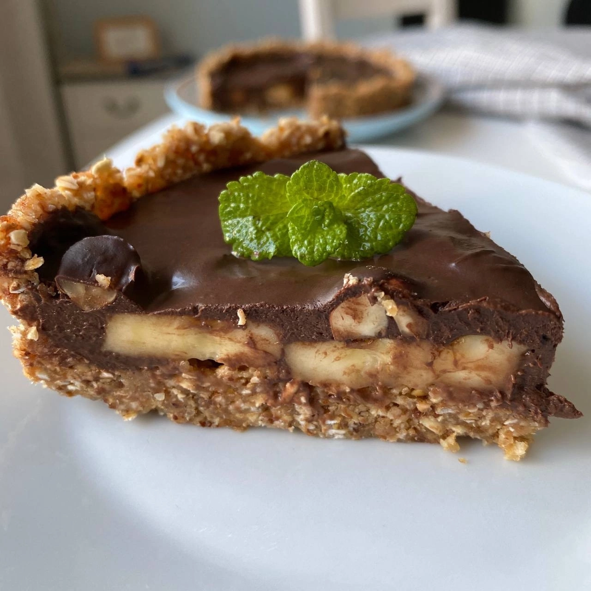 Обжарьте фундук на сковороде до золотистого цвета, затем очистите его. На сухой сковороде также обжарьте овсяные хлопья до лёгкой золотистости. Перемолите орехи и хлопья в блендере, добавляя финики. Вливайте кофе и добивайтесь однородной пластичной массы.Уплотните массу в форме диаметром 16 см, можно использовать разъёмное кольцо с пергаментом или любую другую форму, застеленную пленкой. На эту основу уложите кружочки банана для прослойки.Для шоколадной начинки растопите шоколад на водяной бане. Затем пробейте его с бананом и постепенно добавляйте эспрессо. По желанию, в начинку можно добавить цельный фундук.Вылейте шоколадную начинку на основу с бананом и отправьте в холодильник на несколько часов, чтобы она застыла.Не упустите возможность угостить себя и своих близких этим замечательным десертом, который украсит любой праздник!