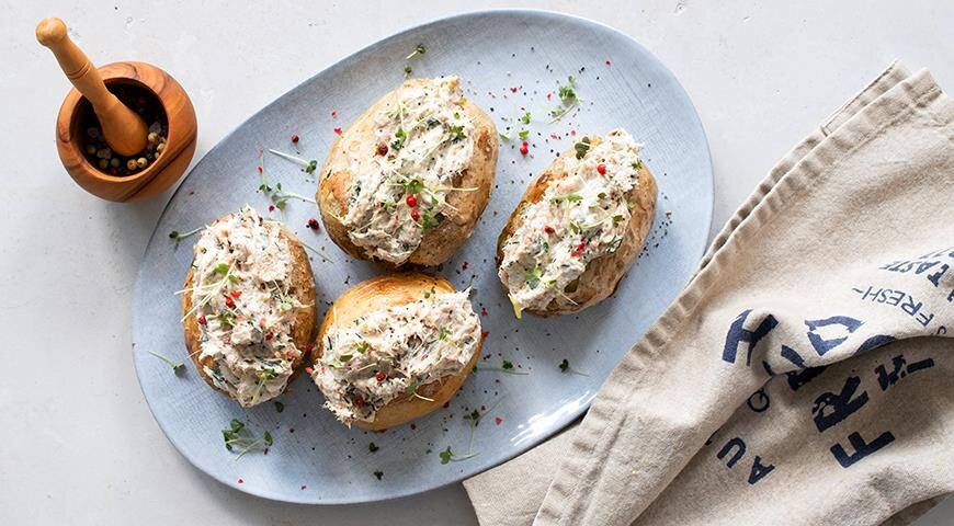 Запеченный картофель напоминает известные фастфудовые блюда с начинками, но с нотками скандинавской кухни. Копченая скумбрия, горчица и укроп создают великолепное сочетание, которое порадует даже самых взыскательных гурманов. Чтобы сбалансировать жирность копченой рыбы, рекомендуется добавить натуральный йогурт – это освежает вкус. Однако и нежирная сметана тоже подойдет.