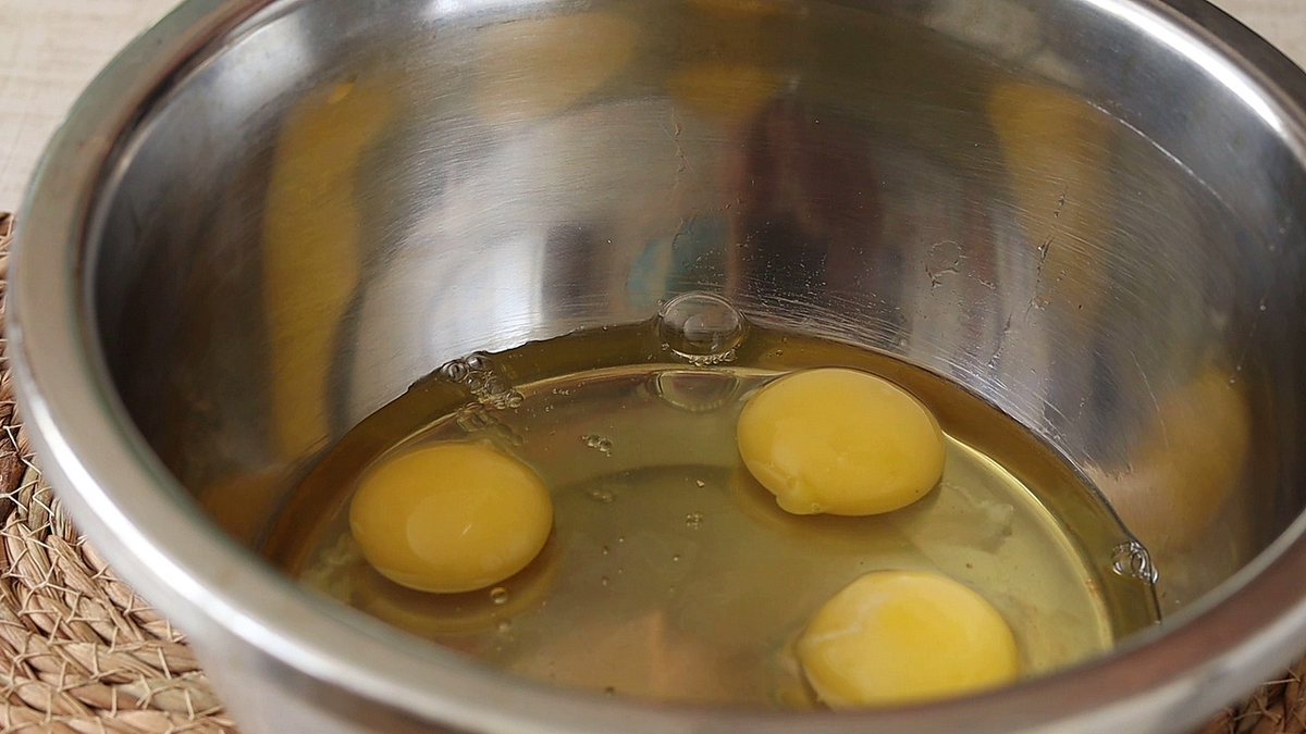 Для начала нужно разбить 5 яиц в большую миску.