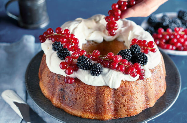 Поместите кекс на сервировочное блюдо, полейте 200 мл взбитых сливок, украсьте 200 г смеси ягод (красная смородина и ежевика) и посыпьте сахарной пудрой. Подавайте с оставшимся сиропом.