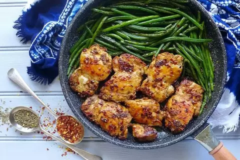 В большой кастрюле доведите воду до кипения, добавьте щепотку соли и стручковую фасоль. Варите до готовности, следя за тем, чтобы не переварить. После этого откиньте фасоль на дуршлаг.В миске объедините куриные бедра с оставшимися ингредиентами, включая растительное масло. Хорошо перемешайте, чтобы специи равномерно распределились.На среднем огне разогрейте сковороду с толстым дном. Выложите бедра в один слой и обжаривайте их до золотистой корочки — около 6-8 минут. Переверните и готовьте еще 2-3 минуты с другой стороны.Сдвиньте куриные бедра на одну сторону сковороды. Наклоните сковороду так, чтобы масло скатилось на другую сторону, и добавьте туда стручковую фасоль. Обжаривайте, периодически помешивая, чтобы фасоль равномерно пропиталась специями.Как только бедрышки станут золотистыми и хорошо прожаренными, аккуратно переложите их на сервировочное блюдо вместе с фасолью.Приятного аппетита!