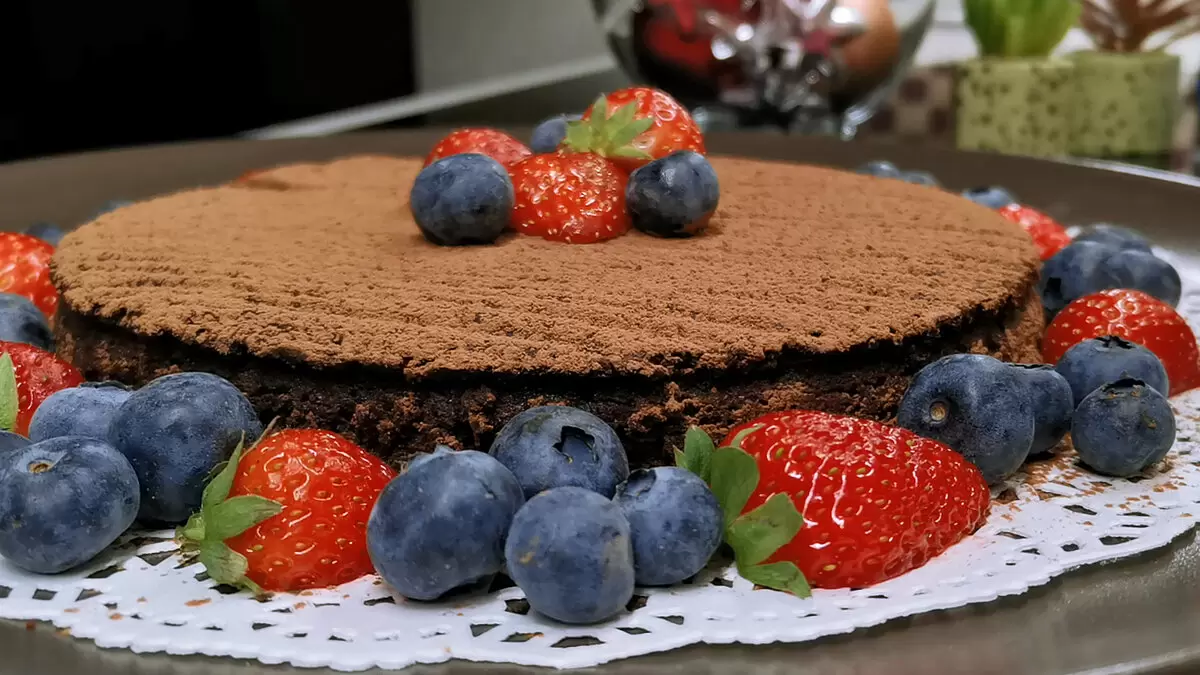 Выпекайте 30 минут, после чего дайте торту немного остыть, затем аккуратно снимите форму. Переверните торт, уберите пергамент и закройте пленкой, чтобы он охладился в холодильнике. Перед подачей на стол снимите пленку и обильно посыпьте какао-порошком. Украшайте на свой вкус — добавьте свежие ягоды или другие любимые угощения.