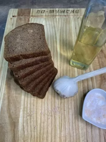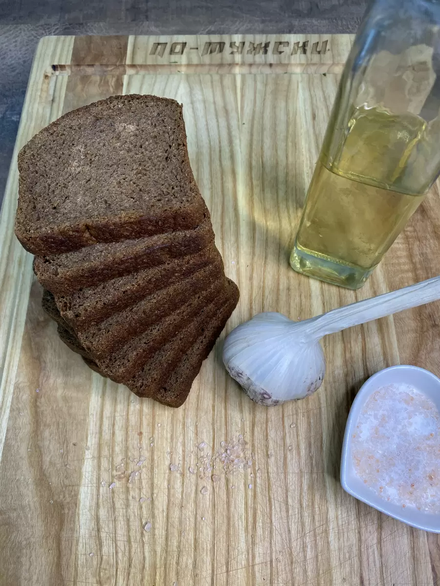 Пока чеснок поджаривается, бородинский хлеб нужно нарезать на крупные бруски. После того, как чеснок станет золотистым, его следует убрать из масла, а в оставшемся ароматном жире обжарить нарезанный хлеб с обеих сторон до красивой корочки.