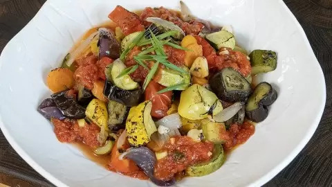 Запеченные овощи перед подачей обжариваются с помощью газовой горелки для создания аппетитной корочки и сервируются с томатным соусом. Это простое, но невероятно вкусное блюдо станет замечательным дополнением к мясу или рыбе, а также может быть подано как отдельный фантастический ужин!