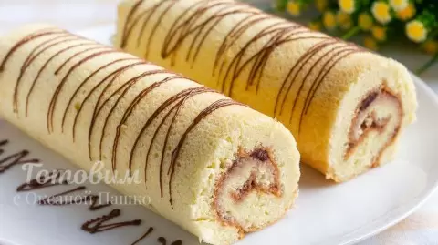 5. Как только бисквит испечется, аккуратно положите его на полотенце, удалите пергамент и скрутите в рулет, пока он еще горячий. Это позволит ему сохранить форму.