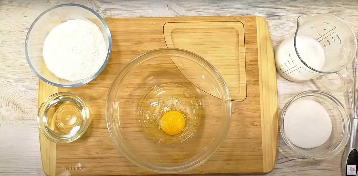 Для начала необходимо взбить яйцо с щепоткой соли, добавив в массу сахар и ванильный сахар. Затем вливается молоко и растительное масло, которое можно заменить растопленным сливочным. После этого следует аккуратно добавлять муку с разрыхлителем и замешивать тесто, добиваясь однородной консистенции.