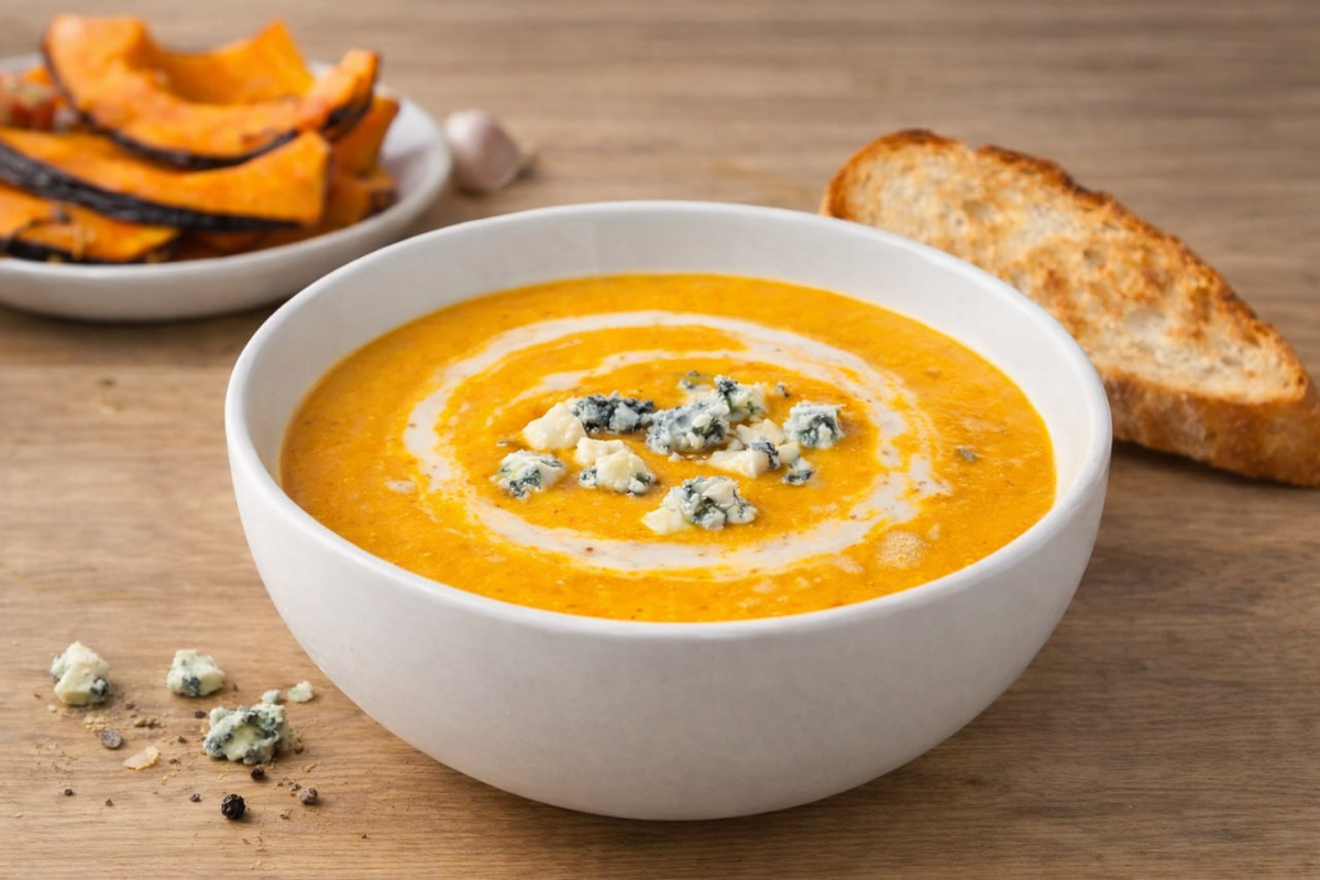 Перед подачей суп раскладывают по тарелкам, посыпая сверху крошеным сыром с голубой плесенью, которая слегка растает и придаст дополнительный вкус. Такой суп — возможность изменить настроение, обогатив его любимыми специями или заменив сыр на козий, если хочется чего-то более мягкого.