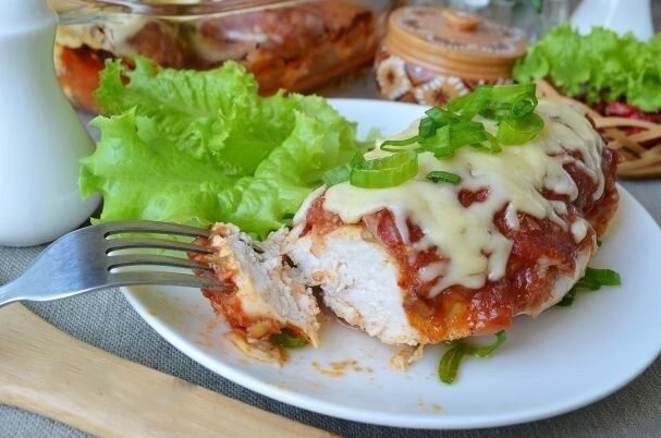 После этого куриные филе нужно обильно покрыть соусом "Сальса". Поместите форму в разогретую духовку и запекайте в течение 30 минут.