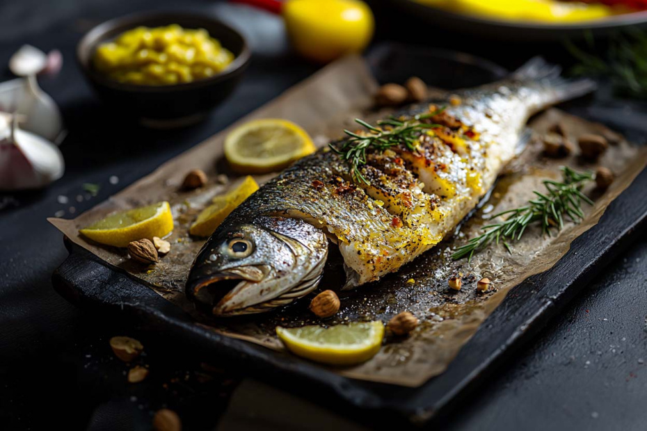 Процесс начинается с подготовки рыбы. Тушку сибаcа необходимо аккуратно надрезать с боков, чтобы лучше впитать ароматы. Затем растворенная смесь кориандра и грецкого масла равномерно распределяется на мясе. Фейхоа превращается в пюре и наносится на внутреннюю часть тушки, придавая ей сладковатый вкус.