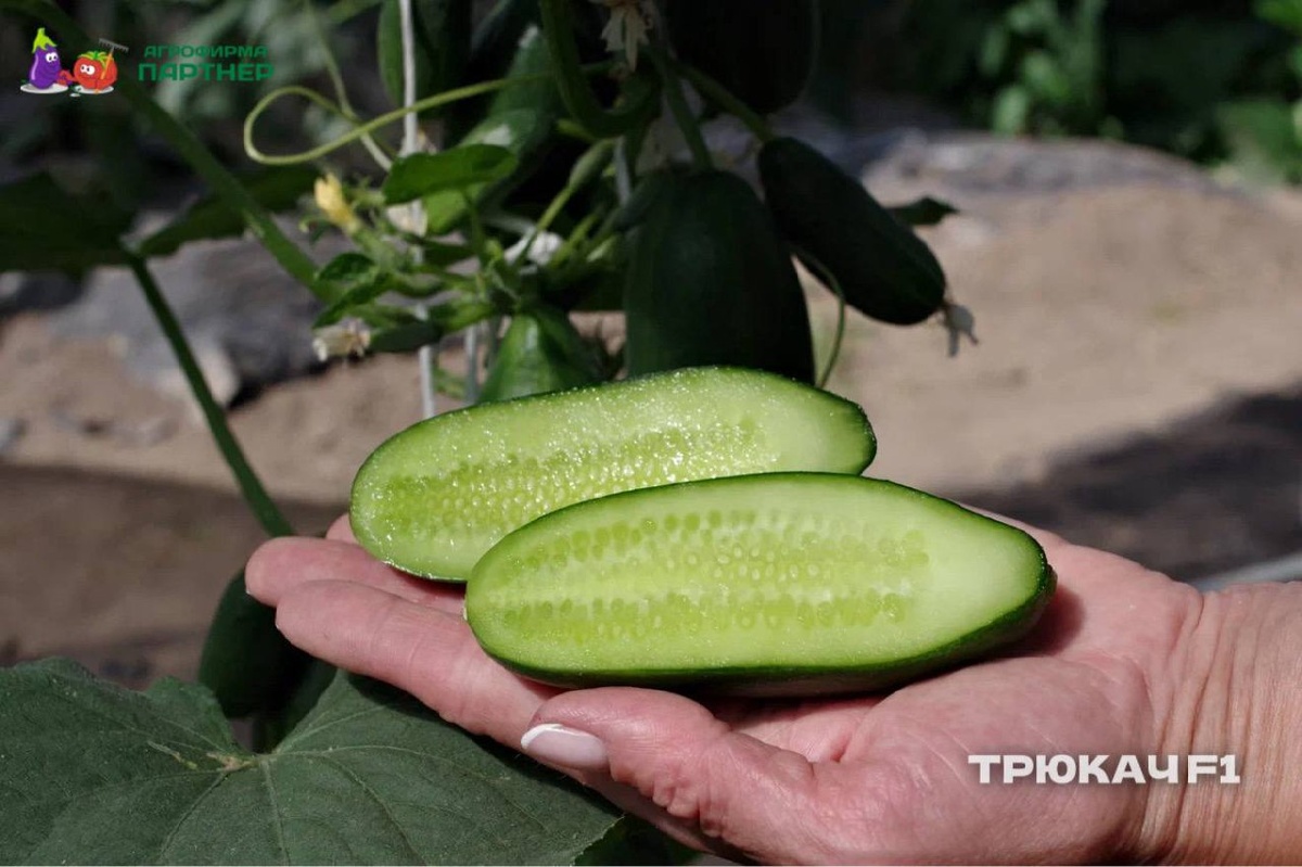 - ТРЮКАЧ F1: компактный сорт с мелкими листьями, плоды длиной 8-10 см. Отличаются ярким вкусом и ароматом.