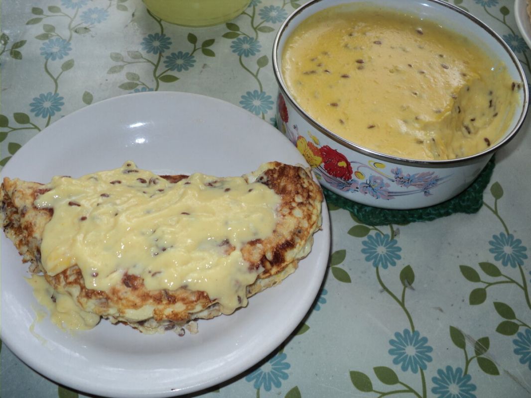 После того как блин подпекся, его можно аккуратно перевернуть. Если он будет слишком толстым, проще разделить смесь на две части.