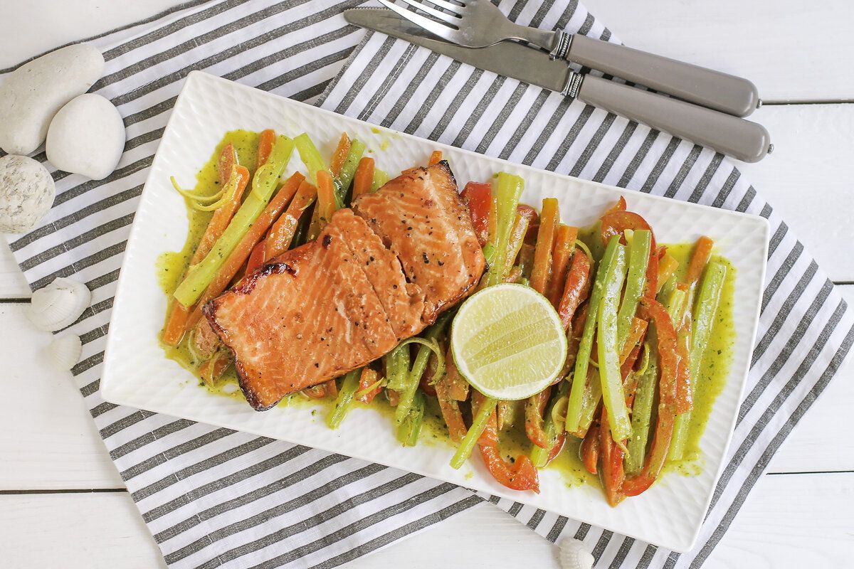Форель подают сразу с овощами, полив соком лайма по вкусу. Приятного аппетита!