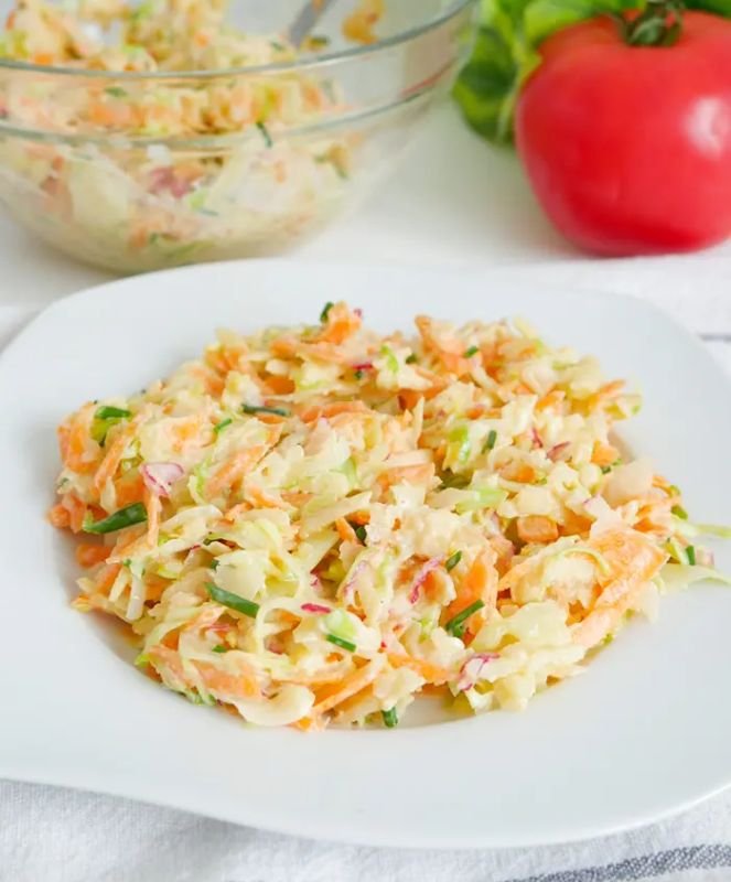 Теперь в глубокой миске соедините капусту, редис, морковь и лук, добавьте заправку и аккуратно перемешайте. Уберите салат в холодильник на 20 минут — это время необходимо для того, чтобы все вкусовые нотки смешались и раскрылись в полной мере.