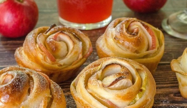 Перед запеканием булочки смазываются взбитым желтком. Выпекаются они в течение 20-25 минут до золотистой корочки. После того как булочки немного остынут, их можно аккуратно извлечь из формочек и, по желанию, посыпать сахарной пудрой. Нежные дрожжевые булочки «Розочки» с яблоками готовы к подаче!