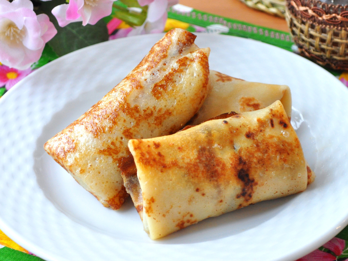 На хорошо разогретой сковороде выпекаем тонкие блины до золотистой корочки с обеих сторон. Важно следить за консистенцией теста: если оно слишком густое, добавьте немного молока, чтобы блины легко сворачивались без трещин.