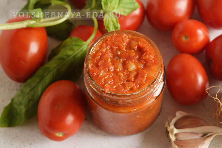В завершение добавьте к соусу измельченные листья базилика и орегано, приправьте солью по вкусу и тушите еще несколько минут. Так как это рецепт на зиму, не забудьте добавить ложку уксуса для сохранности.