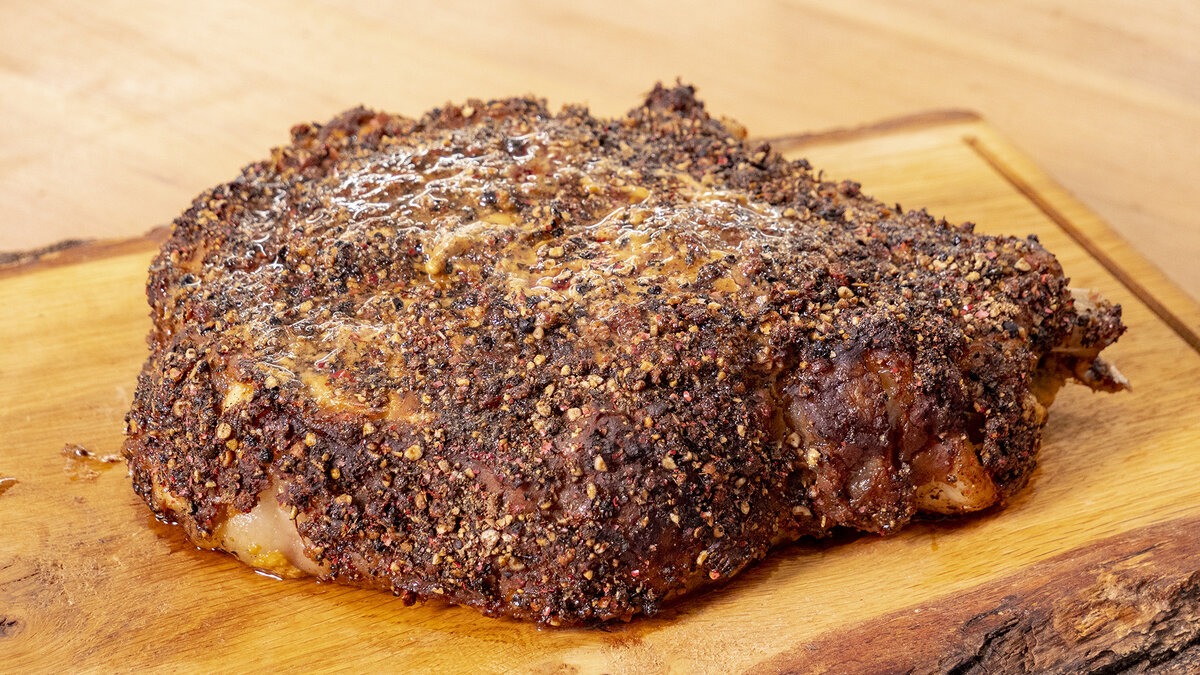 Когда мясо обжарится, переложите его на противень, предварительно застеленный пергаментом. Чтобы специи лучше держались, обмажьте стейк горчицей и посыпьте крупным перцем.