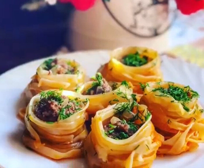 Сформируйте небольшие фрикадельки из фарша и разместите каждую в макаронных "гнездах". Залейте блюдо кипятком или бульоном, чтобы макароны были погружены на 2/3. Накройте крышкой и варите на среднем огне до закипания, затем уменьшите нагрев до минимума.