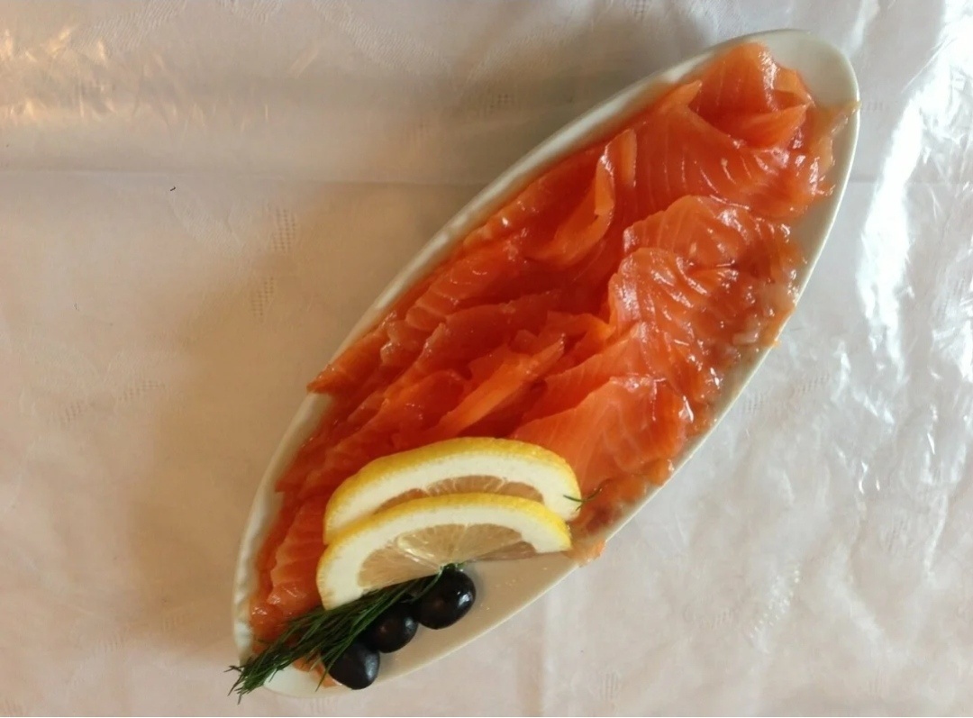 - Рыбная нарезка: лосось слабосолёный, палтус копчёный