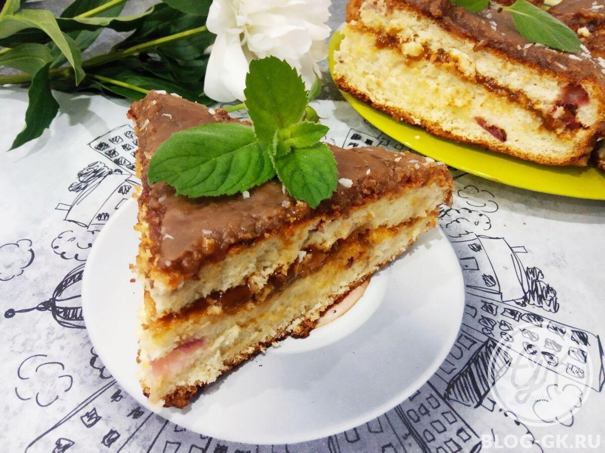 После выпекания охладить пирог и разрезать его на два коржа. Промажьте нижний корж вареным сгущенным молоком.