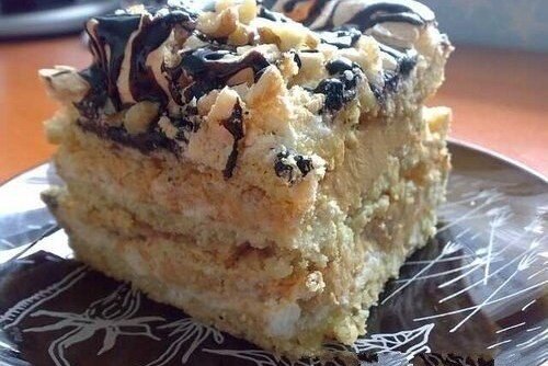 Для крема взбить 200 г сливочного масла с банкой вареного сгущенного молока. Половину крема нанести на первый корж, посыпать рублеными орехами. Далее, повторить с вторым коржем. На третий корж нанести глазурь и посыпать орехами. Рекомендуется оставить торт на ночь, чтобы он настоялся и стал особенно вкусным.