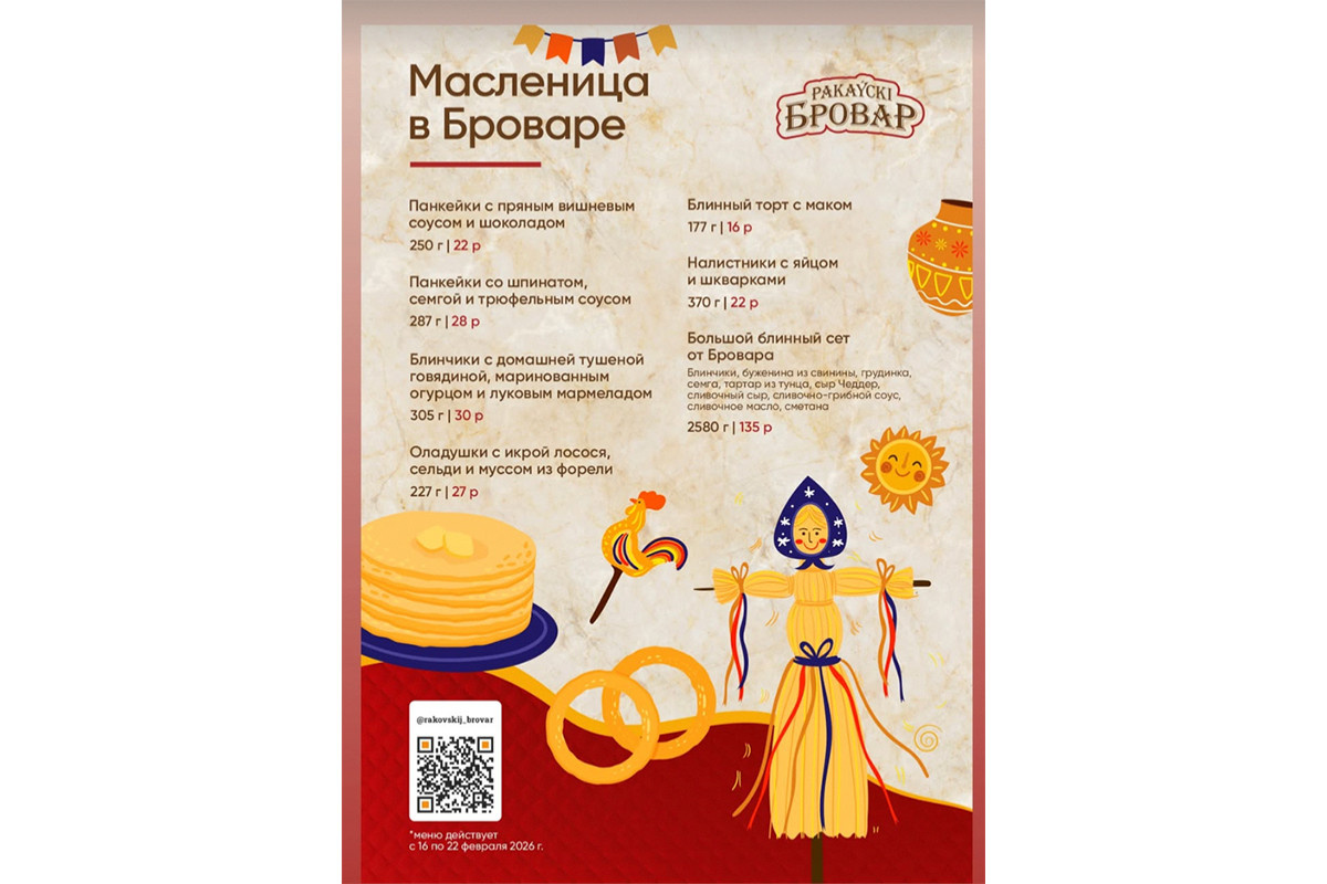 «Раковский бровар»: Здесь можно попробовать блинный сет за 135 рублей, который весит 2,5 килограмма и включает не только блины, но и буженину, семгу и другие деликатесы. Цены на сладкие блины начинаются от 16 рублей, а соленые — от 22 рублей.