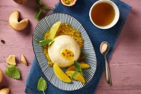 Очистить мякоть маракуйи, нарезать апельсины и красиво распределить по тарелкам. Украсить десерт свежими листьями мелиссы для добавления яркости и аромата.