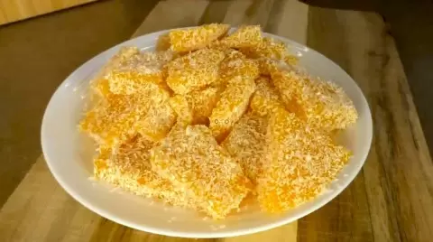 7. После охлаждения нарезать на порции и обсыпать кокосовой стружкой, создавая эстетично оформленный десерт.