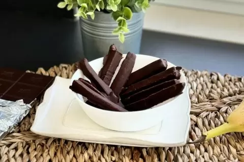 Сладость бананов в удачном tandemo с горьковато-сладким темным шоколадом создает изысканное угощение, которое удовлетворит даже самых искушенных любителей сладкого. Приготовить банановые палочки очень легко: всего лишь разрежьте банан пополам, нарежьте его на полоски и окуните в растопленный шоколад. После небольшого времени в холодильнике, закуска полностью готова!