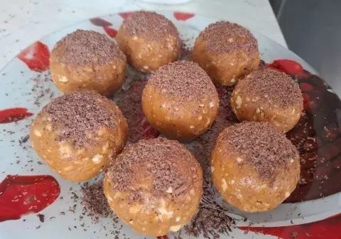 Печенье и жареные орехи измельчаются так, чтобы остались небольшие кусочки. Взбивается мягкое масло с сгущенкой, после чего все компоненты объединяются, можно даже перемешивать руками — результат получается невероятно вкусным.
