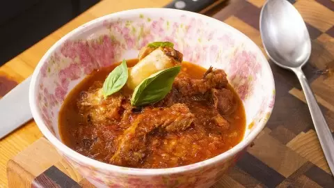После обжаривания мяса добавляется лук, который нужно продолжать обжаривать на среднем огне, периодически помешивая. Не забудьте приправить смесь солью, перцем и добавить лавровый лист. Когда лук станет мягким и уменьшится в объеме, в сковороду наливается фильтрованная вода, чтобы она полностью покрыла мясо. Накрываем крышкой и оставляем тушиться на сильном огне минимум 40 минут.