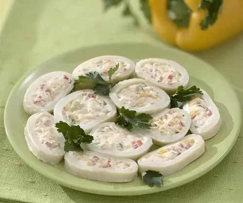 Полученную смесь аккуратно нафаршируйте остывшие тушки кальмаров, а затем поместите их в холодильник на 30 минут. После этого нарежьте фаршированные кальмары кружочками толщиной примерно 1 см. Подавайте на красивых тарелках, украсив свежей зеленью.