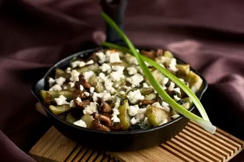 На подготовительном этапе баклажаны нужно очистить и разрезать вдоль на четвертинки, затем нарезать брусочками. Их замачивают в соленой воде на 20 минут, после чего промывают. Далее грибы нарезают и обжаривают с луком на оливковом масле. Перемешивают с баклажанами и сверху посыпают фетой, запекая до золотистого цвета. При подаче блюдо дополняют лимонным соком.