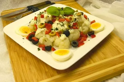Первым делом стоит подготовить овощи: цветную капусту разделить на небольшие соцветия, а лук мелко нарезать. Перец следует нарезать кубиками, а оливки – кружочками. Яйца отварить до готовности, а чеснок мелко порезать или выдавить.