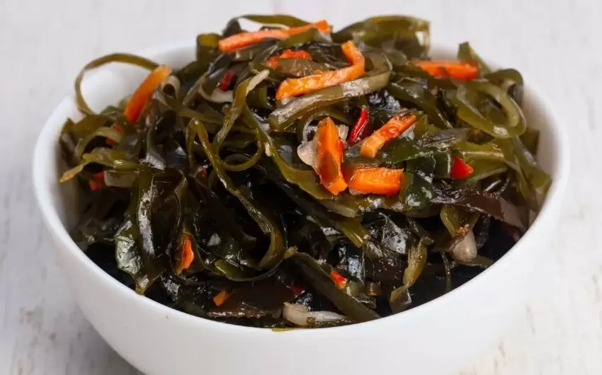 Сначала очистите морковь. Яблоко и морковь натрите на крупной терке. Затем добавьте соль и сахар, хорошо перемешайте. Морскую капусту откиньте на дуршлаг, после чего смешайте с остальными ингредиентами и заправьте маслом, добавив соль и сахар по вкусу.