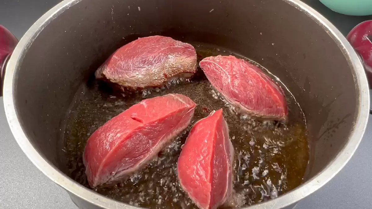 Перед началом готовки нарезается мясо на крупные куски — это придаст ему сочность. Лук и морковь следует нарезать крупной соломкой. В казан или толстостенную кастрюлю наливается растительное масло, после чего мясо обжаривается с обеих сторон до золотистой корочки.