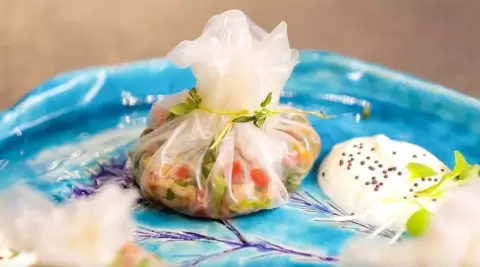 Греческий йогурт, предназначенный для соуса, смешивается с белым перцем, оливковым маслом, солью и натёртым корнем хрена. Завершает эту палитру нотка апельсинового аромата. Рисовая бумага замачивается в воде до мягкости, а затем на неё выкладывается небольшая порция начинки. Упаковка хинкали осуществляется путём соединения краёв теста и закрепления их веточкой тимьяна. Не забудьте подать блюдо с соусом, посыпанным семенами горчицы!