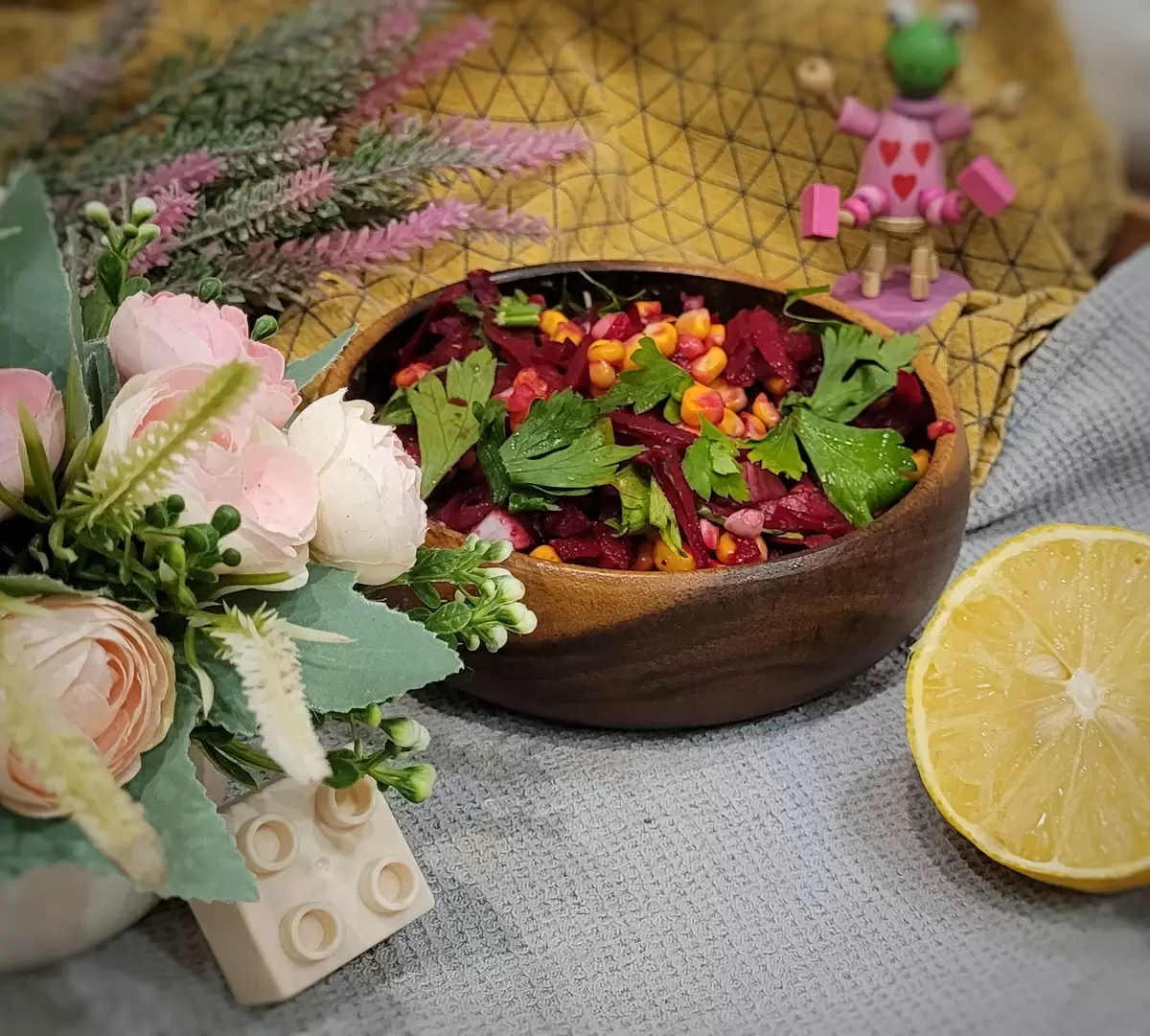 Кукуруза, напротив, привносит радость и легкость в этот ансамбль, создавая яркий контраст с насыщенной, бархатной свеклой. Вместе они создают гармоничное сочетание — как солнце и земля, как ночь и день.