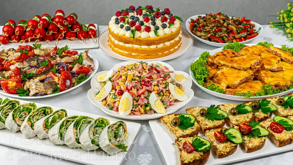 Тем, кто любит закуски, понравятся легкие канапе с помидорами черри и моцареллой, а также великолепный рулет из лаваша с хрустящей зеленью и нежным лососем. Радуют глаз и вкус бутерброды с печенью трески — это классика, которая не устаревает и всегда вызывает восторг.