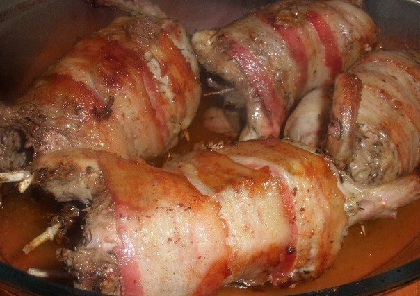 Начните с того, что тщательно промойте и обсушите перепелов. Оберните их в тонкие ломтики бекона, не забывая посолить и поперчить. Ветчину и шницели также нарежьте очень тонко. Перепелов заверните в ветчину и шницели, а затем обяжите их нитью для удобства.