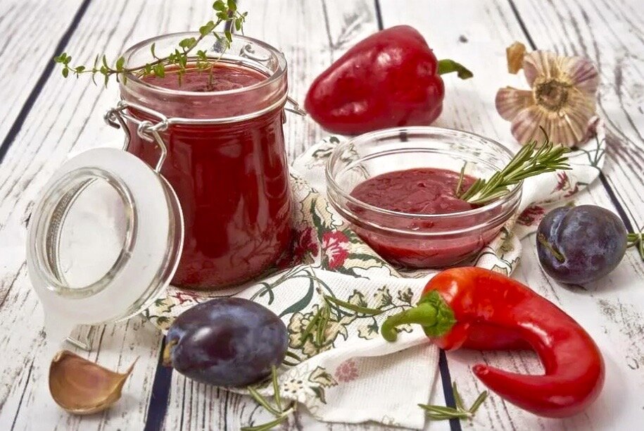 Сливы — 2 кг, болгарский перец — 1 кг, лук — 200 г, чеснок — 100 г, томатная паста — 60 г, сахар — 100 г, соль — 40 г, растительное масло — 100 мл, перец чили — по вкусу, специи (тмин, черный перец, кориандр, гвоздика) — по вкусу.